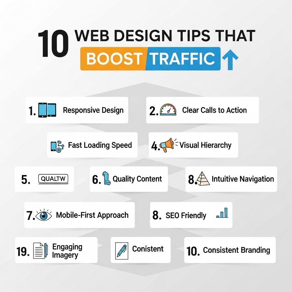 Implementing responsive design, optimizing loading speeds, and creating engaging content are key web design tips that can significantly boost traffic.